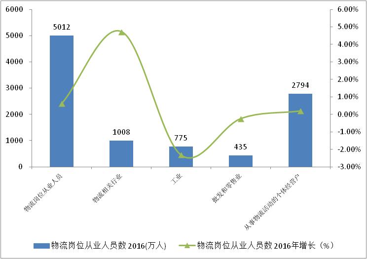 據中國物流與采購聯合會統計調查測算,2016年末,我國物流崗位從業人員數為5012萬人,比上年增長0.6%,占全國就業人員6.5%。