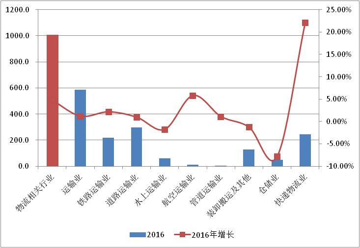 2016年末物流與主要服務業行業增長情況對比(單位: %)