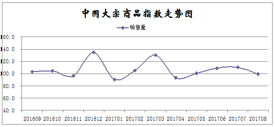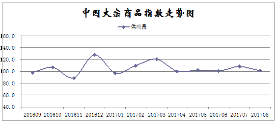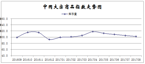 由中國物流與采購聯合會調查、發布的2017年8月份中國大宗商品指數為100.4%,升幅較7月份收窄8.0個百分點,連續七個月呈現上升態勢。主要分項指數中,銷售指數環比回落0.9個百分點,是影響綜合指數升幅明顯收窄的主要原因,供應指數和庫存指數繼續上升,但升幅有所收窄。本月中國大宗商品指數顯示,高利潤刺激下,國內商品產量仍在增加,需求受價格過快上漲、房地產市場降溫等因素影響有所回落,但商品庫存并未出現明顯積壓,市場運行仍將呈現穩中趨升的基本態勢。