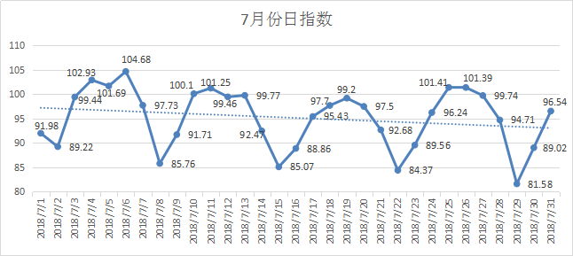【行業(yè)總體日指數(shù)】從日指數(shù)變化來(lái)看,7月份指數(shù)呈4個(gè)完整周期和1個(gè)不完整周期。指數(shù)最低值是7月29日的81.58;指數(shù)最高值是7月6日的104.68。 全月僅有7天的指數(shù)水平達(dá)到基準(zhǔn)數(shù)(100)以上,比上個(gè)多6天;從趨勢(shì)線上看,從月初到月末呈微弱的下降趨勢(shì)。