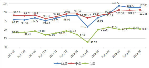 【長(zhǎng)、中、短途月指數(shù)】7月份,長(zhǎng)途月指數(shù)為90.3;中途的月指數(shù)為101.35;短途的月指數(shù)為102.83。與6月份的指數(shù)比較,長(zhǎng)途月指數(shù)下降了0.39;中途月指數(shù)上升了0.18;短途月指數(shù)上升了0.06。