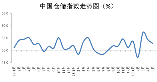 中國(guó)物流與采購(gòu)聯(lián)合會(huì)發(fā)布的2019年5月份中國(guó)物流業(yè)景氣指數(shù)為52.8%,較上月回落0.7個(gè)百分點(diǎn);中國(guó)倉(cāng)儲(chǔ)指數(shù)為52.8%,較上月回落1.5個(gè)百分點(diǎn)。