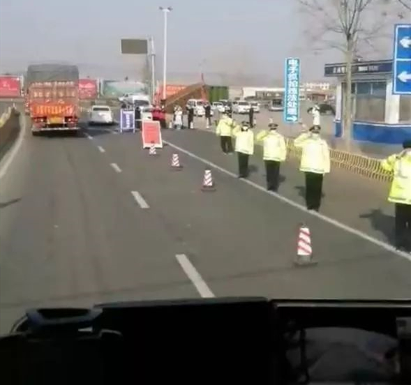 圖:1月30日,安心驛站用戶(hù)趙崇正受山東臨沂蘭陵縣政府的委托,運(yùn)送大蒜到武漢。返程下高速時(shí)候,交警路政站在路邊給他們敬禮。他不禁熱淚盈眶,因?yàn)閷?duì)卡車(chē)司機(jī)來(lái)說(shuō)“這是最高的禮儀”。