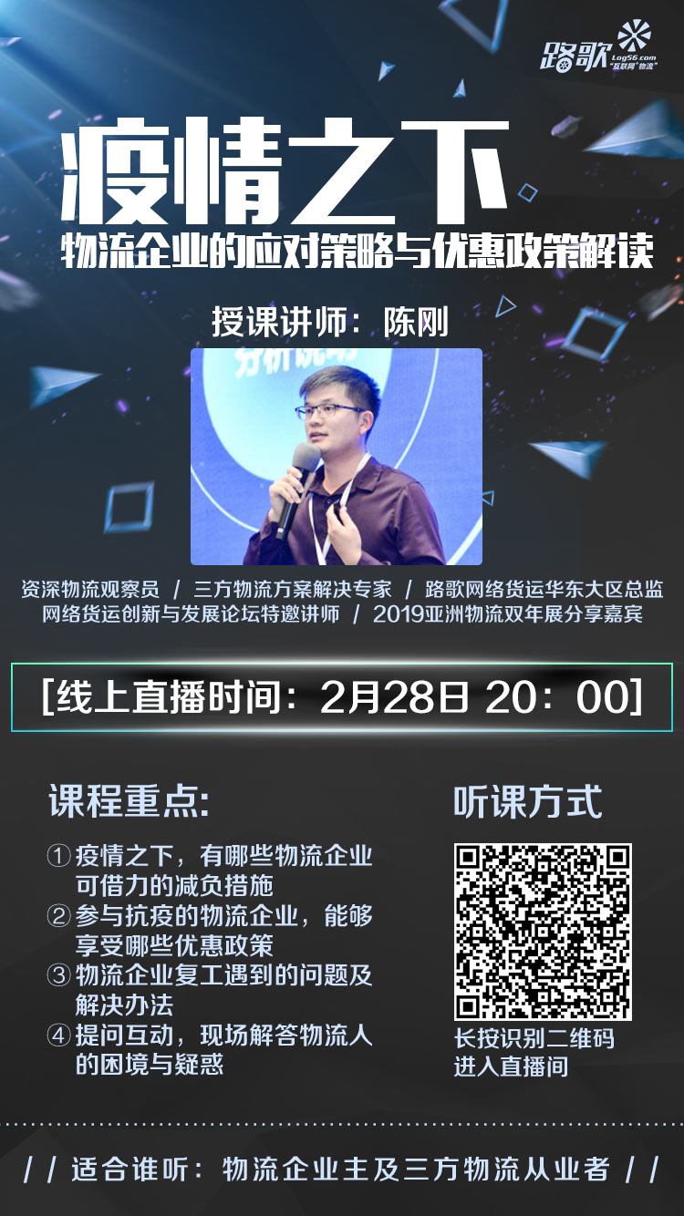 基于以上,路歌網(wǎng)絡(luò)貨運華東大區(qū)總監(jiān)陳剛將于2月28日20:00開始《疫情之下,物流企業(yè)的應(yīng)對策略與優(yōu)惠政策解讀》的直播分享,在線解答物流人的困境和疑惑。