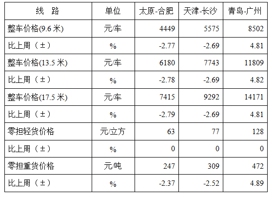 表1 本周部分線路平均價(jià)格及環(huán)比情況對(duì)比