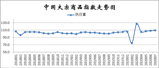 2020年7月份,大宗商品供應(yīng)指數(shù)三連升至109.2%,較上月上升0.9個百分點,為近四個月以來的最高,顯示本月國內(nèi)大宗商品市場的整體供應(yīng)量持續(xù)增加,特別是部分商品在利潤較高的情況下,生產(chǎn)企業(yè)生產(chǎn)熱情高漲,持續(xù)推升商品供應(yīng)量。各主要商品供應(yīng)量均繼續(xù)增加,且大部分品種供應(yīng)增速仍在加快,僅鋼鐵供應(yīng)量增速有所減緩。