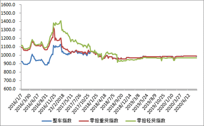 分車型看,各車型指數環比漲跌互現。其中,整車指數為988.89點,比上周回落0.08%;零擔輕貨指數為968.19點,與上周持平;零擔重貨指數為989.23點,比上周回落0.08%。