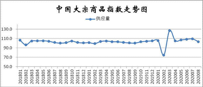 2020年8月份,大宗商品供應指數為103.3%,較上月回落5.9個百分點,指數在連續四個月上升后,本月出現回落,顯示大宗商品市場供應增速繼續下滑。從各主要商品情況來看,本月各商品供應量均呈現較上月增加的態勢,但除成品油供應量增速繼續加快外,其余品種均呈現增速減緩的格局。