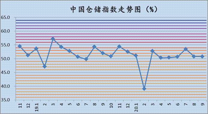 中國物流與采購聯(lián)合會與中儲發(fā)展股份有限公司聯(lián)合調(diào)查的2020年9月份中國倉儲指數(shù)為50.8%,與上月持平。設(shè)施利用率、收費價格、主營業(yè)務(wù)成本、平均庫存周轉(zhuǎn)次數(shù)、業(yè)務(wù)活動預(yù)期等主要分項指數(shù)較上月均有所回升。
