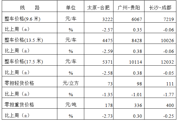 分車型看,各車型指數(shù)環(huán)比有所回落。其中,整車指數(shù)為1025.36點(diǎn),比上周回落1.32%;零擔(dān)輕貨指數(shù)為1049.34點(diǎn),比上周回落1.31%;零擔(dān)重貨指數(shù)為1024.29點(diǎn),比上周回落1.38%。