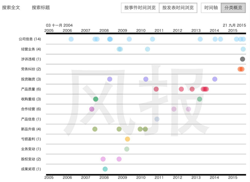 “風報”系統(tǒng)包含歷年的全網(wǎng)重大事件數(shù)據(jù),作為一個龐大的情報庫,可以展現(xiàn)企業(yè)的歷史事件,并跟蹤現(xiàn)有的事件動向。通過開創(chuàng)性的企業(yè)事件挖掘模型,自動判別每件事件的性質(zhì),進行分類處理,并通過時間軸展示事件類型與密度分布,揭示事實真相,發(fā)現(xiàn)企業(yè)情報信息。