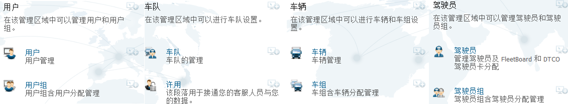 FleetBoard®系統可以通過建立“子車隊”或“駕駛員組”的方式,為有分公司或多條線路的客戶實現分層、分組管理,提高對車輛和駕駛員的管理效率。FleetBoard®在帳戶權限上也可以設置分層,車隊長或駕駛員組組長可以查看車隊或駕駛員組的信息,而企業高層管理人員或企業主則擁有最高權限,可以看到所有車隊、車輛及駕駛員信息。