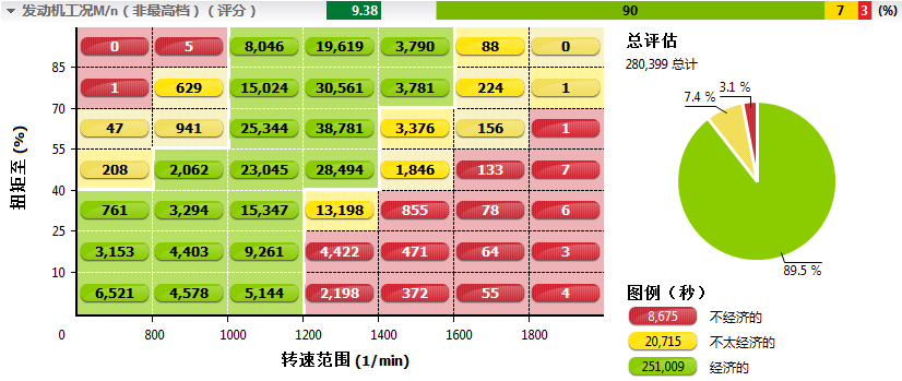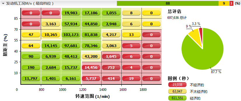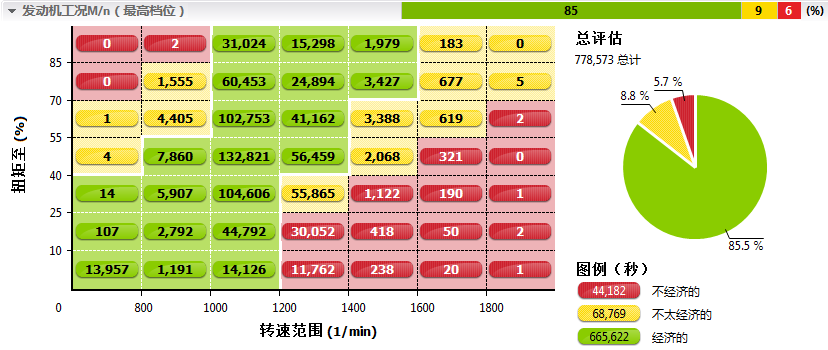 將車輛盡量保持在高擋位,也是讓車輛達到最佳經濟性的方法之一。從上表可以看出,先比1月份,該車輛3月份擋位配合得更好,最高擋行駛占比更大。