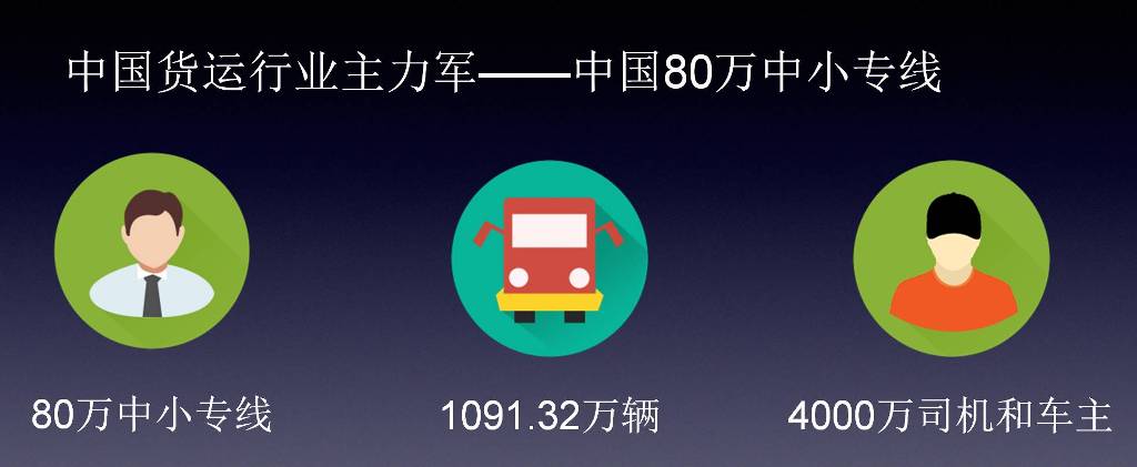 2014年全國公路運輸費用約4.2萬億,其中快遞占了3500億,其余都是貨運物流。目前承擔這90%以上貨物運輸的主力軍是80萬家中小物流企業。