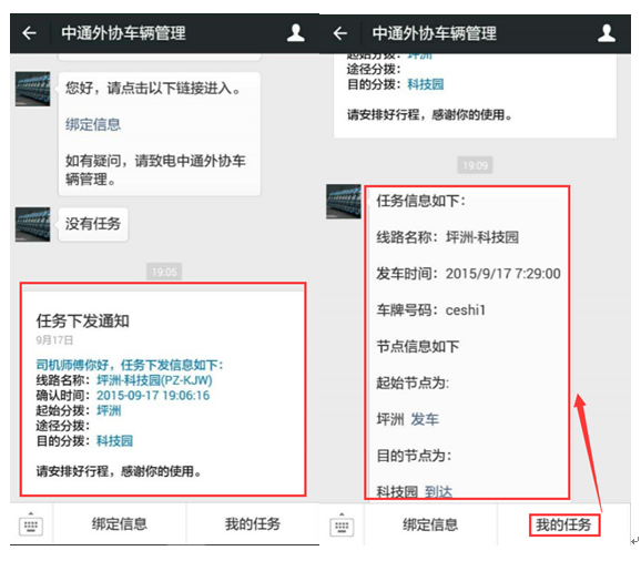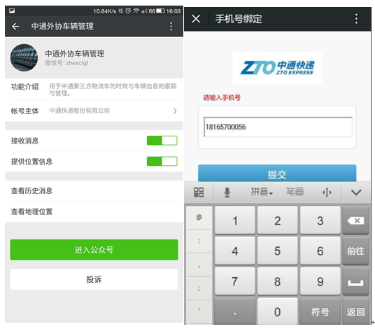 司機在關注“中通外協車輛管理公眾號”之后,就可以在線接受系統的下發任務,手機端成為查閱運輸任務和要求信息的新工具。下圖左圖是進入公眾號的頁面,右圖是獲取運輸任務的頁面。頁面中現實了本次運輸任務的基本要求。如路線、時間等。