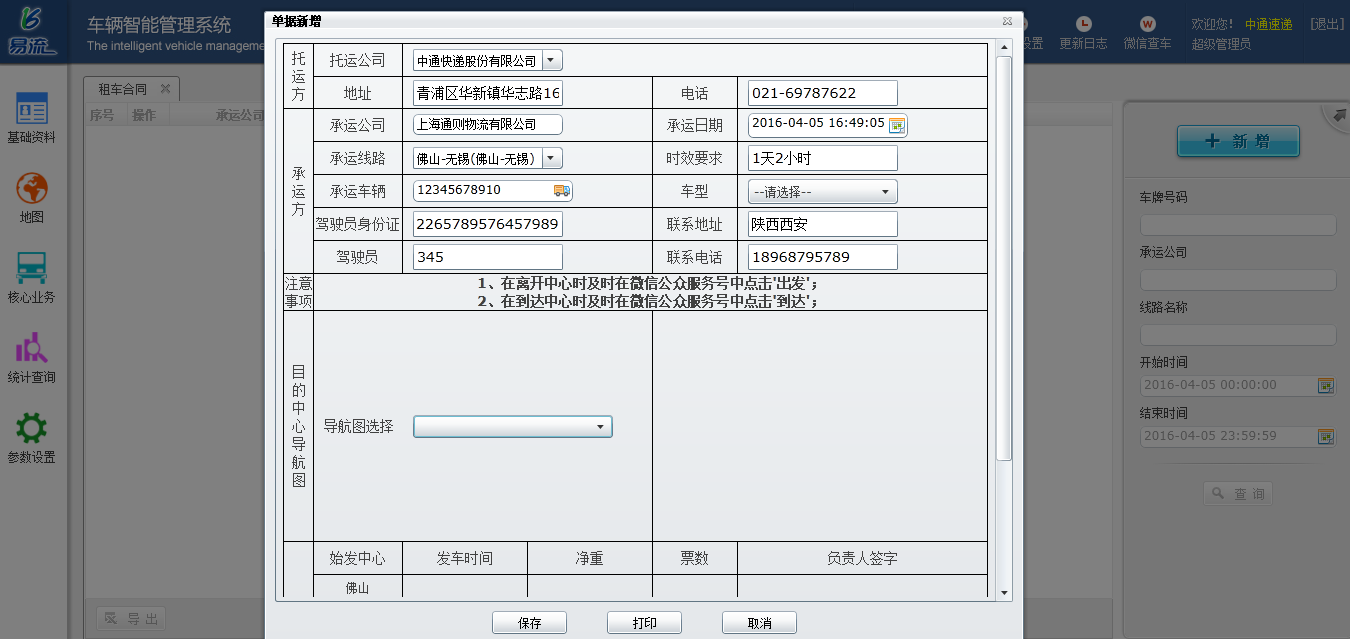 當然,該運輸任務信息是PC端平臺下發的,具體的操作頁面如下圖所示:在本頁面中,只要填寫了托運公司、承運公司、地址、承運車輛、司機信息、時效要求、聯系人信息即可發送給指定的司機,即運輸任務推送成功。司機拿著本頁的打印紙張開始運輸任務。其中,司機的信息需要全面準確,需要對其資質進行驗證和審核,保障貨物安全和運輸啊安全。