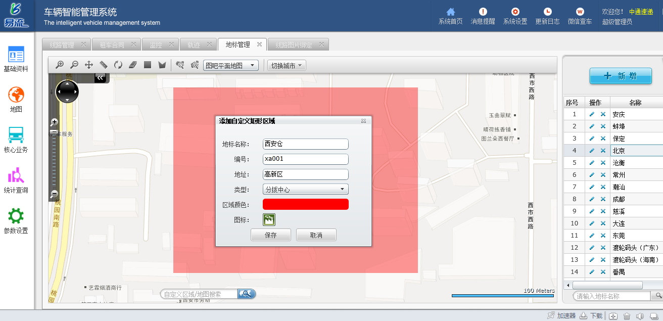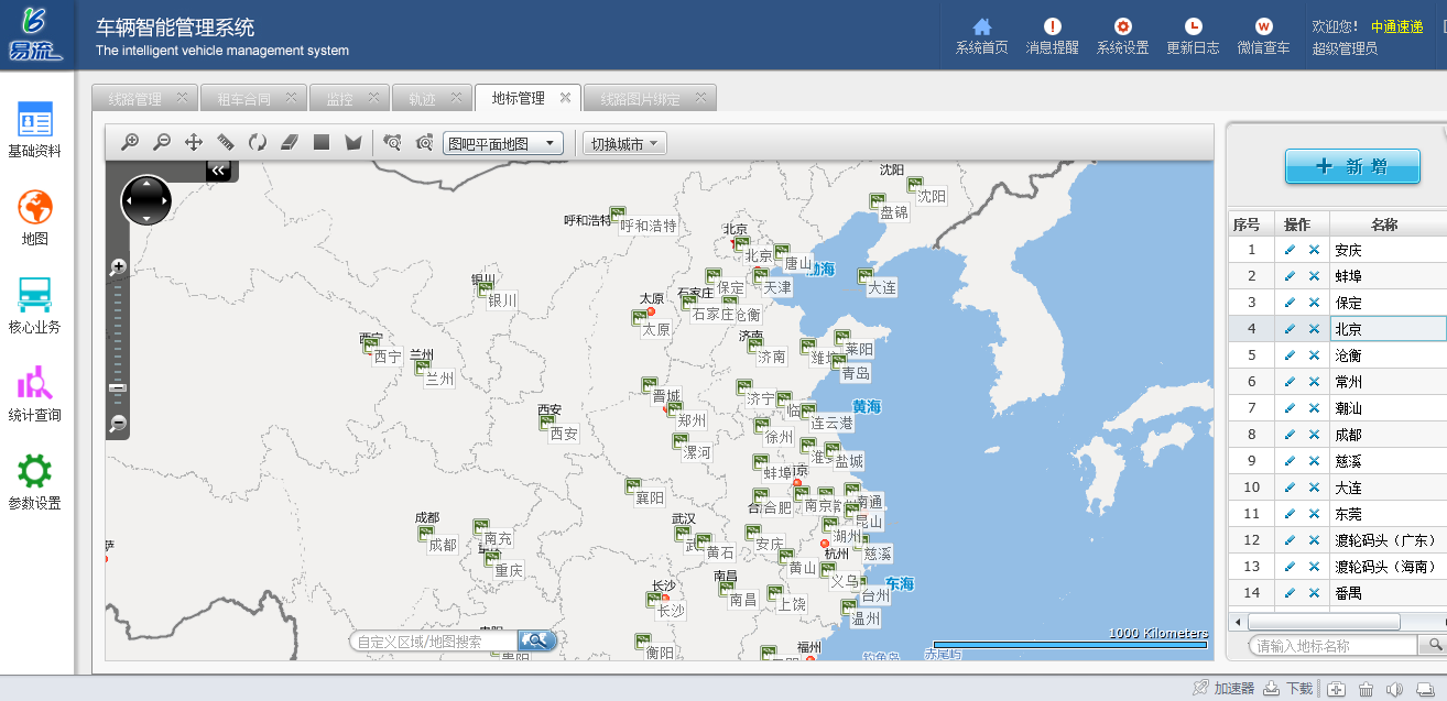 就是對中通快遞各個分撥中心全部按照實際位置對應標注在電子地圖上,使得以上各區域均被監管中,監管者能及時看到其狀態。上圖是這些點信息的添加頁面,單擊“新增”填寫名稱、標號、地址、類型、顏色、圖標后保存即可在地圖上添加此位置。下圖是標注好后的全國范圍內的分撥中心分布地圖。單擊每一個名稱都可以直接定位到對應的分撥中心位置。
