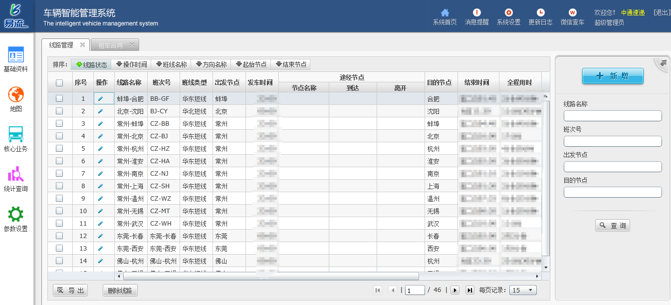 這一部分是時效管理的基礎工作也是核心工作,即約定每一條運輸路線的時效要求。如始發分撥發車時間,途徑分撥到達、離開時間,目的地分撥到達時間以及距離信息等。這部分一般是根據行業經驗來填寫,但隨著企業數據的積累,該數據會越來越接近實際情況。另外,這一部分是隨著企業的實際情況靈活變化的,這部分工作做得越好,時效管理的效果就越好。下圖就是已經規定好的運輸線路。
