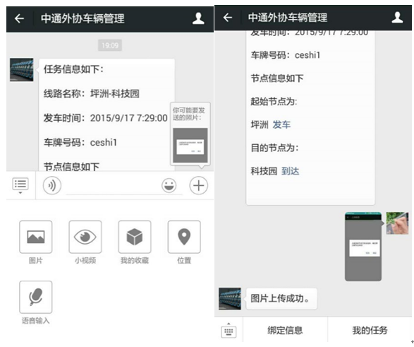 本案例中異常信息的采集由司機本人通過自己的智能手機,用微信的拍照、位置、語音、視頻、時間等等功能實現,不需要再投入任何外部設備。具體信息反饋成功后,可以作為企業對運輸過程中實際情況的參考,作為考核司機的參考和證據。下圖就是司機使用拍照上傳功能實現操作行為數據上報。