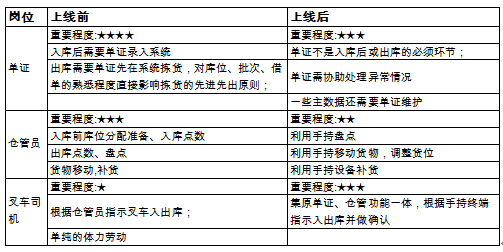 由上可見,系統(tǒng)上線后,單證、倉管員和叉車司機三個崗位實現(xiàn)了部分的職能合并,從而對單證人員提出了更高要求:新的倉管崗位要求會駕駛叉車,會使用手持終端。同時,各崗位基于信息系統(tǒng)工作,工作效率和準確性得到了很大提高。