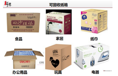 可回收紙箱類型的商品包括:食品、家居、辦公用品、玩具、紙巾、電器類。