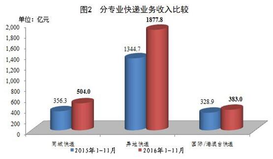 1-11月份,全國(guó)快遞服務(wù)企業(yè)業(yè)務(wù)量累計(jì)完成278.9億件,同比增長(zhǎng)52.8%;業(yè)務(wù)收入累計(jì)完成3544.1億元,同比增長(zhǎng)44.3%。其中,同城業(yè)務(wù)收入累計(jì)完成504億元,同比增長(zhǎng)41.4%;異地業(yè)務(wù)收入累計(jì)完成1877.8億元,同比增長(zhǎng)39.6%;國(guó)際/港澳臺(tái)業(yè)務(wù)收入累計(jì)完成383億元,同比增長(zhǎng)16.5%。