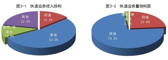 1-11月份,同城、異地、國(guó)際/港澳臺(tái)快遞業(yè)務(wù)收入分別占全部快遞收入的14.2%、53%和10.8%;業(yè)務(wù)量分別占全部快遞業(yè)務(wù)量的23.8%、74.2%和2%。與去年同期相比,同城快遞業(yè)務(wù)收入的比重下降0.3個(gè)百分點(diǎn),異地快遞業(yè)務(wù)收入的比重下降1.7個(gè)百分點(diǎn),國(guó)際/港澳臺(tái)業(yè)務(wù)收入的比重下降2.6個(gè)百分點(diǎn)。