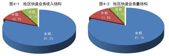 1-11月份,東、中、西部地區(qū)快遞業(yè)務(wù)收入的比重分別為81.2%、10.7%和8.1%,業(yè)務(wù)量比重分別為81.1%、11.8%和7.1%。與去年同期相比,東部地區(qū)快遞業(yè)務(wù)收入比重下降了0.7個(gè)百分點(diǎn),快遞業(yè)務(wù)量比重下降了0.9個(gè)百分點(diǎn);中部地區(qū)快遞業(yè)務(wù)收入比重上升了0.4個(gè)百分點(diǎn),快遞業(yè)務(wù)量比重上升了0.6個(gè)百分點(diǎn);西部地區(qū)快遞業(yè)務(wù)收入比重上升了0.3個(gè)百分點(diǎn),快遞業(yè)務(wù)量比重上升了0.3個(gè)百分點(diǎn)。