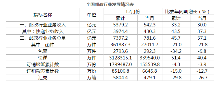 12月份,快遞業(yè)務(wù)量完成34億件,同比增長40.4%;業(yè)務(wù)收入完成430.3億元,同比增長37.3%。