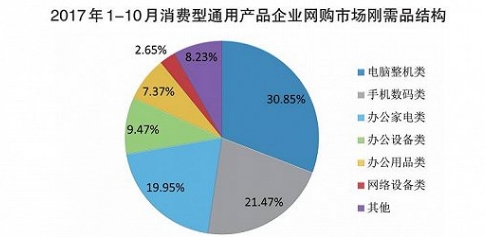《中國企業電商化采購發展報告(2017)》顯示,目前針對企業提供消費型通用產品的電子商務平臺主要由綜合性B2C電子商務網站的企業采購頻道主導,如京東企業購、蘇寧企業購、天貓企業購等。