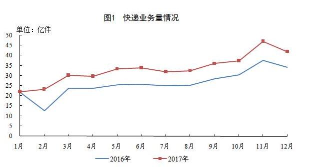 12月份,全國快遞服務企業業務量完成42億件,同比增長23.7%;業務收入完成519.8億元,同比增長20.8%。