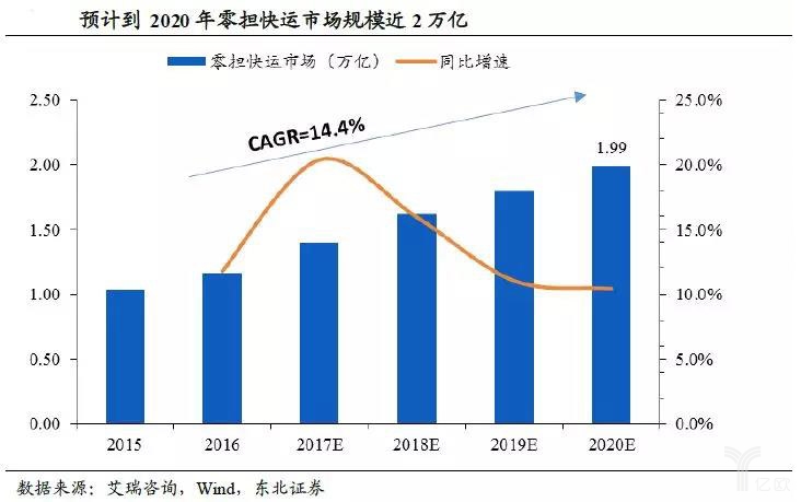 經(jīng)測算,預計到2020年,零擔快運市場份額在公路貨運中的占比將達30%,達到2萬億級別,2016-2020年年均復合增速達14.4%。