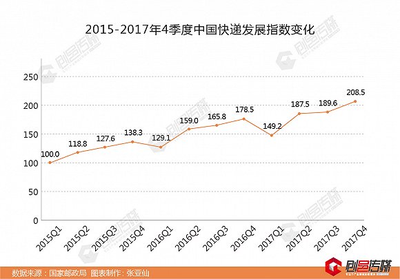 另外,國家郵政局1月12日發布的《2017年四季度中國快遞發展指數報告》顯示,2017年四季度,中國快遞發展指數為208.5,同比提高16.8%;普及指數為165.6,同比提高9.9%,環比提高7%,快遞的普及程度整體呈現穩步提高態勢,快遞準公共服務屬性凸顯。