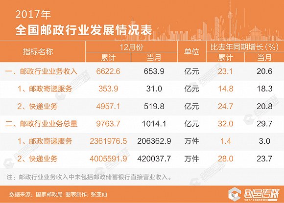 郵政作為快遞行業的重要力量,每年的業務量和收入都在增加。具體數字:2017年,郵政行業業務收入(不包括郵政儲蓄銀行直接營業收入)累計完成6622.6億元,同比增長23.1%;業務總量累計完成9763.7億元,同比增長32%。