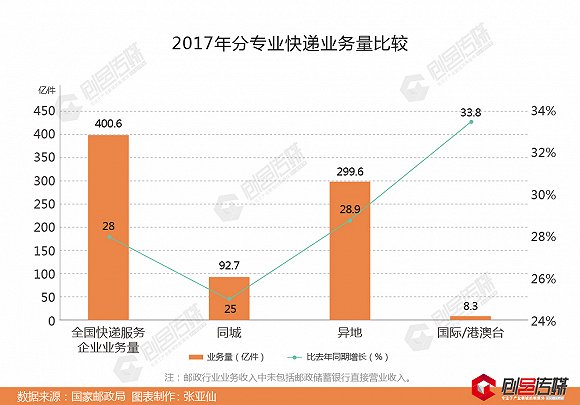 從寄達方向來看,同城快遞、異地業務、國際港澳臺都呈現增長的態勢,說明目前的快遞業務區域分布比較均衡。2017年,全國快遞服務企業業務量累計完成400.6億件,同比增長28%;業務收入累計完成4957.1億元,同比增長24.7%。其中,同城業務量累計完成92.7億件,同比增長25%;異地業務量累計完成299.6億件,同比增長28.9%;國際/港澳臺業務量累計完成8.3億件,同比增長33.8%。