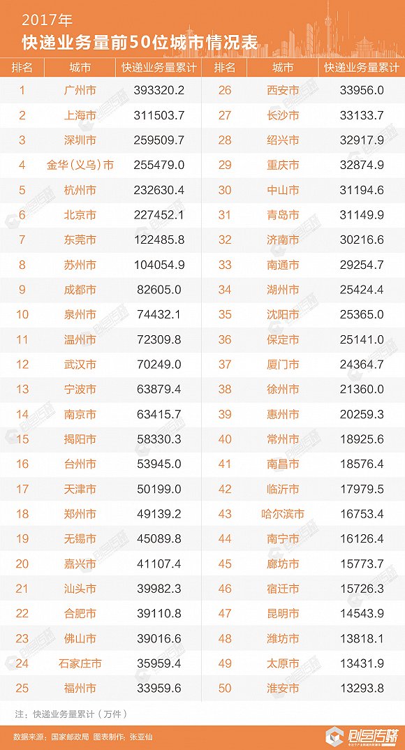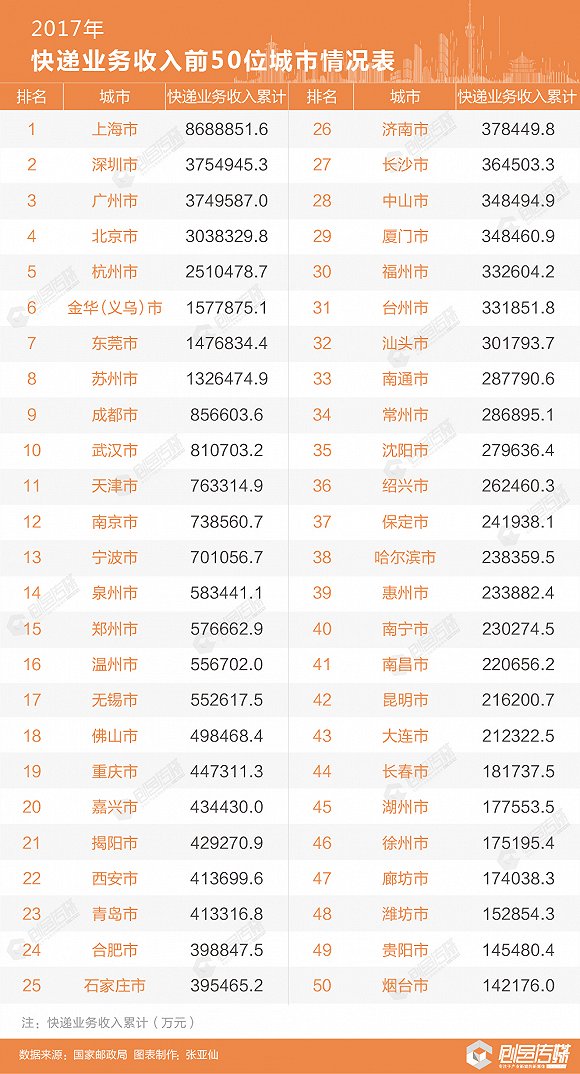 從城市來看,電商越是發達的地方,快遞業務也發達。2017年,快遞業務量前三位分別是廣州、上海和深圳。快遞收入前三位上海、深圳和廣州。基本上呈現東部城市好于西部城市,沿海城市強于內陸城市等特征。