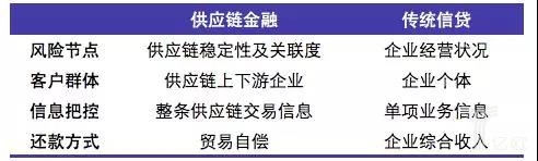 供應鏈金融與傳統信貸最大的差別在于,利用供應鏈中核心企業的資信能力,基于交易過程向核心企業和其上下游相關企業提供綜合金融服務。在風險節點、客戶群體、信息把控、還款方式方面有本質區別。