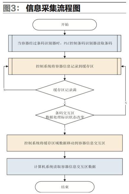 要實現物料信息的準確跟蹤,需要涉及到條碼識別系統、自動控制系統、信息處理系統的協調配合。整個系統在每個需要分流或合流的位置配置一套固定式條碼識別系統,由多個固定條碼閱讀器組成一張信息捕捉網絡。設備控制層完成條碼信息采集、位置關聯、信息暫存等工作。采集到的數據由計算機系統完成顯示和存儲,以便實現物料追蹤。實現過程,如圖3。