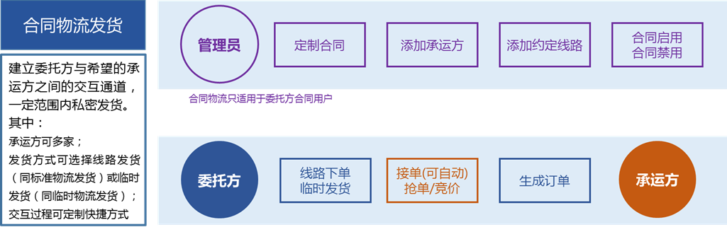 以在線化、流程化為目標,按照集團現有的交易層級及流程進行設計。各分公司與配貨站之間使用聯物流平臺合同物流的交易流程,分別將各分公司定向詢價的常用配貨站進行一對多的合同綁定,建立專屬詢價通道,并對交易結果進行展示和追溯,接收監督。各分公司合同配貨站使用承運方賬號,定向接收詢價信息,使用搶單競價機制,充分公平競爭。