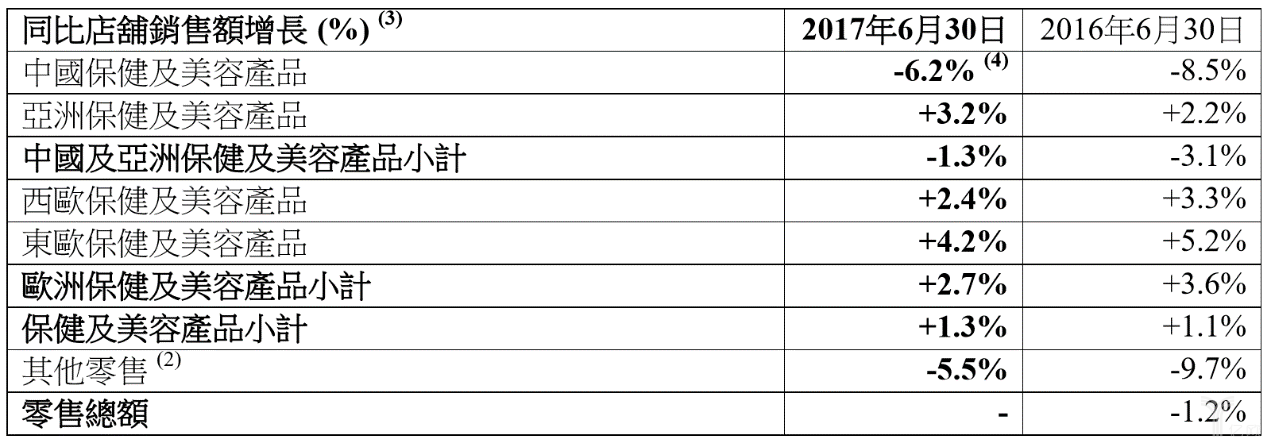 由于新店增長迅猛,導致同店銷售下滑。去年上半年,屈臣氏在國內的同店銷售額增速為-6.2%。跌幅較2016年同期的-8.5%已經有所收窄。實際上,他們在去年第二季度的跌幅已經進一步收縮至-2.7%。