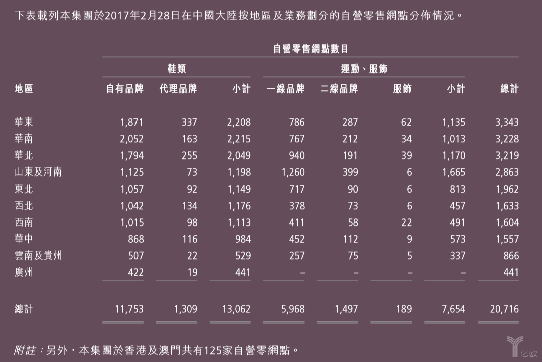 截止到2017年2月28日,百麗在國內共有20716個零售網點,包括了13000多家鞋店和7000多家運動服飾店。