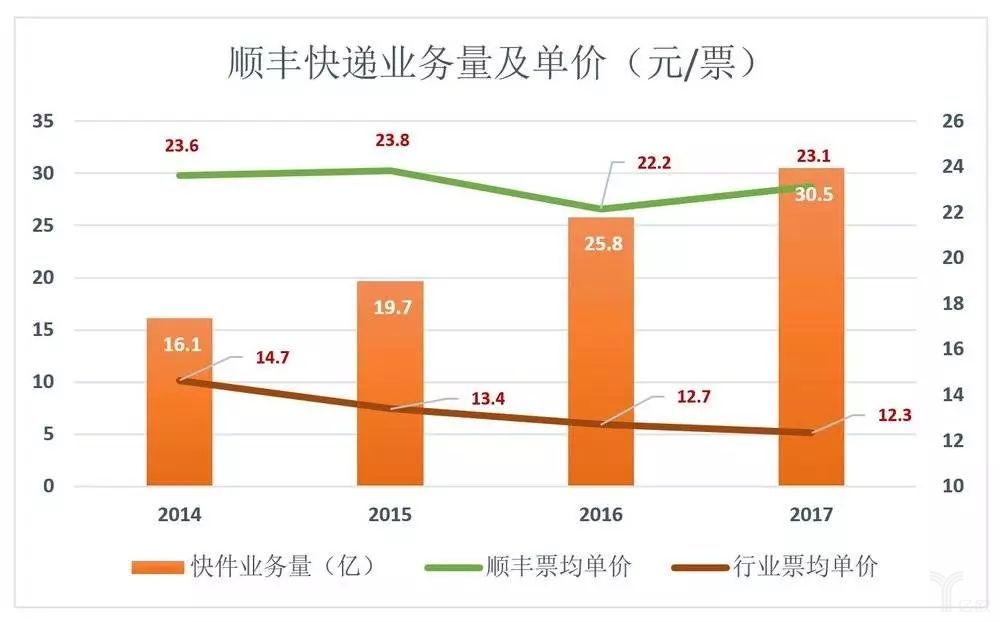 2017年,順豐完成30.5億票,平均每票23.1元,較行業(yè)均價(jià)高87.8%。順豐市場(chǎng)份額下滑說明絕大多數(shù)用戶更在意的是價(jià)格。
