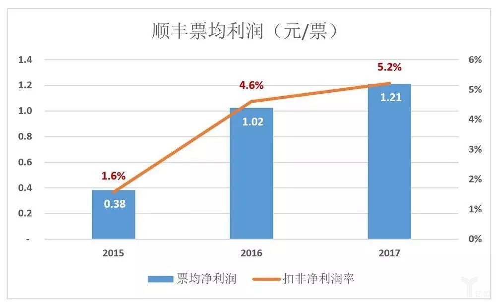 2015年,順豐每票凈利潤僅為0.38元,利潤率1.6%。2017年每票賺1.21元,利潤率達(dá)5.2%。