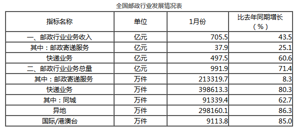 受去年春節假日基數較低因素影響,今年1月行業增速較高。郵政行業業務收入(不包括郵政儲蓄銀行直接營業收入)完成705.5億元,同比增長43.5%;業務總量完成991.9億元,同比增長71.4%。