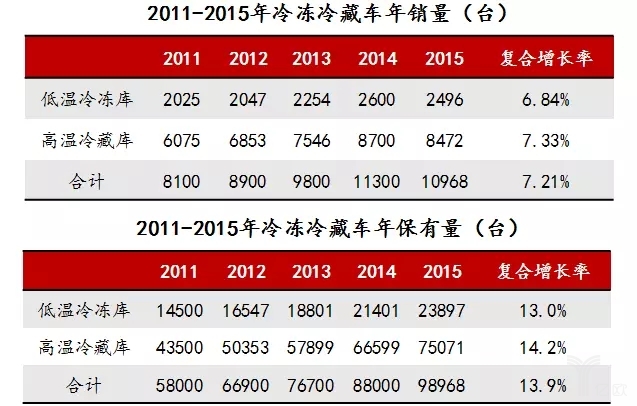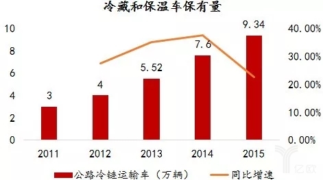 自2013年以來,我國冷凍冷藏車以近萬臺量級增長,并且于2014年突破萬臺大關(guān),新增車輛達1.13萬臺,2011-2015年復合增長率達到7.21%。截至2015年,我國冷凍冷藏車總保有量達9.9萬臺,2011年至2015年,我國冷凍冷藏車保有量復合增長率達13.9%。隨著生鮮電商對冷凍冷藏車需求的不斷拓寬,我們預計冷凍冷藏車市場整體需求仍將保持12%以上的增速。