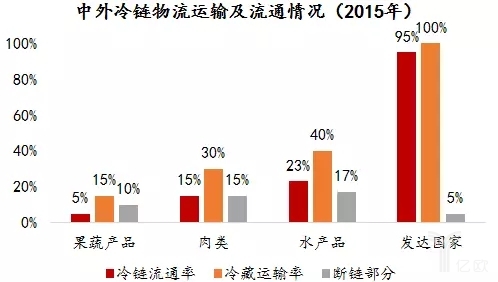 長期以來,我國初級農(nóng)產(chǎn)品冷鏈運輸率一直低于歐美發(fā)達國家。國外果蔬、肉類、水產(chǎn)品的80%~90%為冷鏈運輸,而國內(nèi)冷鏈運輸率僅為15%、30%和40%;國內(nèi)冷鏈過程斷鏈比例高達67%、50%和42%,遠遠高于發(fā)達國家冷鏈斷鏈比例。