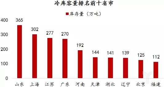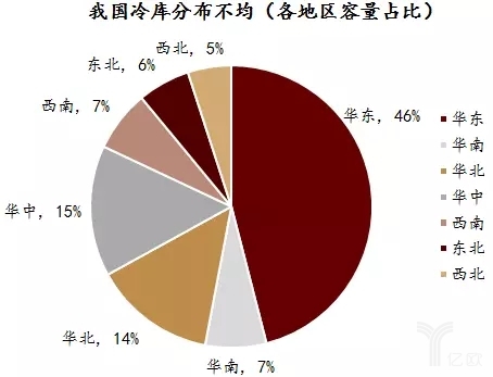 由于我國經(jīng)濟發(fā)展的地域性特點,我國冷庫分布不均勻,華東地區(qū)冷庫容量已占到全國冷庫總?cè)萘拷?6%,其中山東、上海、江蘇發(fā)展速度較快,冷庫容量居前列;而我國果蔬產(chǎn)地的內(nèi)陸各省市市場冷庫容量仍舊偏低,造成冷鏈物流在生產(chǎn)源頭缺乏預冷,產(chǎn)生源頭“斷鏈”。局部供需的不匹配和冷鏈運輸能力不足導致企業(yè)倉儲能力未充分發(fā)揮,與人口、經(jīng)濟發(fā)展并不匹配,這也決定了冷鏈物流未來成長的空間依然較大。