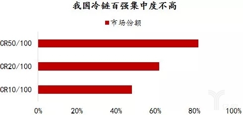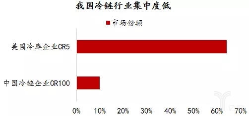 從競爭格局看,中國冷鏈物流行業(yè)處于較早期階段,集中度低,企業(yè)規(guī)模小。根據(jù)中物聯(lián)冷鏈委統(tǒng)計,2015年中國百強企業(yè)收入總額不足冷鏈市場的10%,美國前5強冷庫企業(yè)占市場份額約63%,而從2015年中國冷鏈物流百強企業(yè)排名來看,前10家企業(yè)總收入占百強企業(yè)總收入的48.5%,前20家企業(yè)總收入占百強企業(yè)總收入的61.4%。