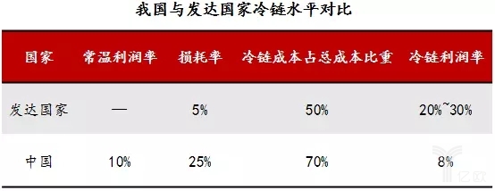 目前看來,預冷環(huán)節(jié)缺失、經(jīng)營分散、運輸網(wǎng)絡(luò)落后、缺乏有效的信息管理是我國冷鏈成本較高的主要原因。我國常溫利潤率是為10%,冷鏈利潤率為8%,而發(fā)達國家冷鏈的利潤率可以達到20%~30%。未來如何做到控制成本,降低商品損耗率是各企業(yè)需要思考的問題,相信這將伴著冷鏈物流的長期發(fā)展逐步得到解決。