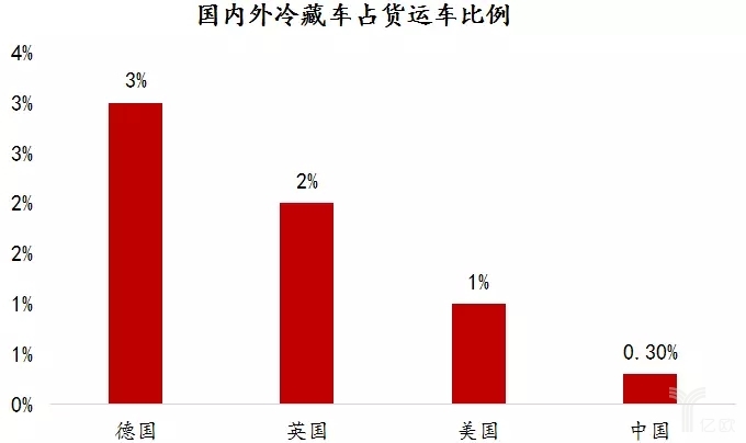 盡管國內(nèi)冷藏車銷量近幾年來出現(xiàn)了較快增長,但從冷藏車占貨運車的比例來看,和國外相比仍有較大差距。德國占比達到3%,英國2%,美國1%,而中國僅為0.3%。
